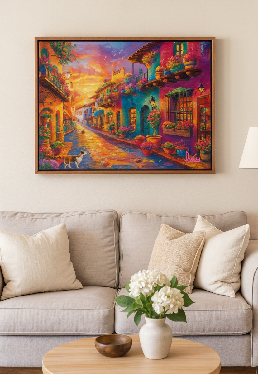 Déjate conquistar por éste paisaje de casas coloridas en acrílico pintadas sobre lienzo de tela en lino, con bastidor de...