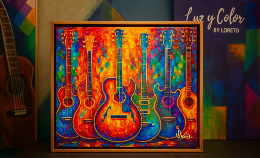 Déjate conquistar por ésta colorida pintura de guitarras en acrílico pintadas sobre lienzo de tela en lino, con bastidor de...