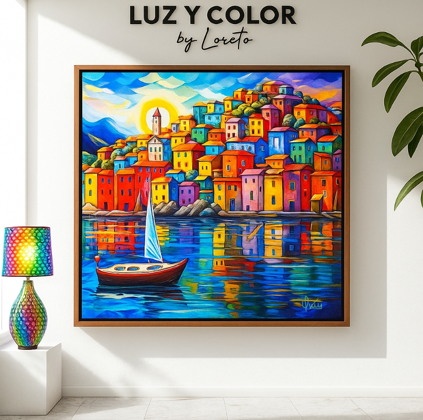Déjate conquistar por ésta bella pintura en acrílico del paisaje de un atardecer en un pueblo costero, pintada sobre tela...